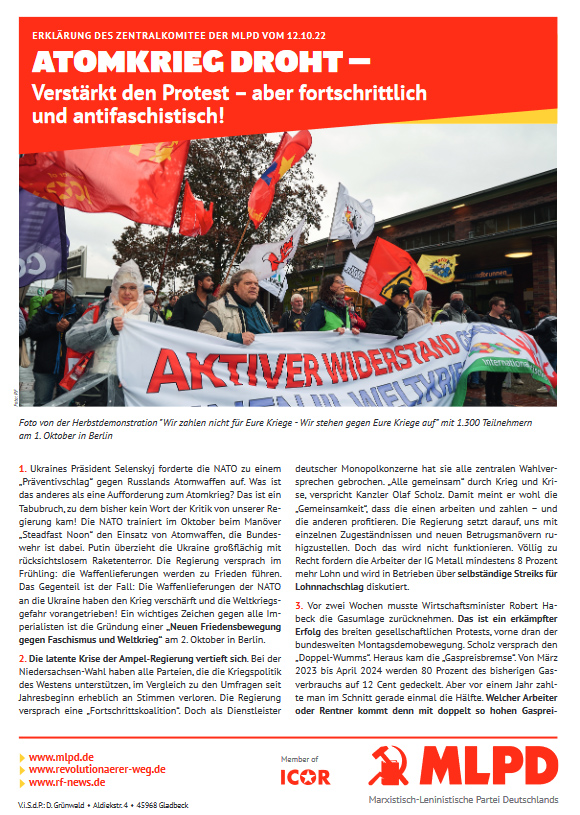 Vordergrundbild z.B. ein Screenshot des Flugblattes Hintergrundbild z.B. ein Foto 319 * 177 Pixel breit Text kurzer Anreißer z.B. "Erklärung des Zentralkomitees der MLPD: Aktiver Widerstand gegen imperialistische Kriegsvorbereitung!" Atomkrieg droht –Verstärkt den Protest – aber fortschrittlich und antifaschistisch! Buttontext z.B. "Flugblatt lesen" Flugblatt lesen Buttonlink z.B. "2018/kw14/dieses-flugblatt-in-pdf-format-in-farbe" 2022/10/atomkrieg-droht-verstaerkt-den-protest-aber-fortschrittlich-und-antifaschistisch Inhalte Dieser Ordner hat zur Zeit keinen Inhalt.