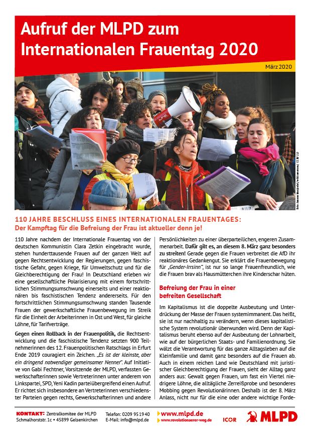 Vordergrundbild z.B. ein Screenshot des Flugblattes Hintergrundbild z.B. ein Foto 319 * 177 Pixel breit Text kurzer Anreißer z.B. "Erklärung des Zentralkomitees der MLPD: Aktiver Widerstand gegen imperialistische Kriegsvorbereitung!" Aufruf der MLPD zum Internationalen Frauentag 2020 Buttontext z.B. "Flugblatt lesen" Flugblatt lesen Buttonlink z.B. "2018/kw14/dieses-flugblatt-in-pdf-format-in-farbe" 2020/03/aufruf-internationaler-frauentag-mlpd.pdf Inhalte Dieser Ordner hat zur Zeit keinen Inhalt.