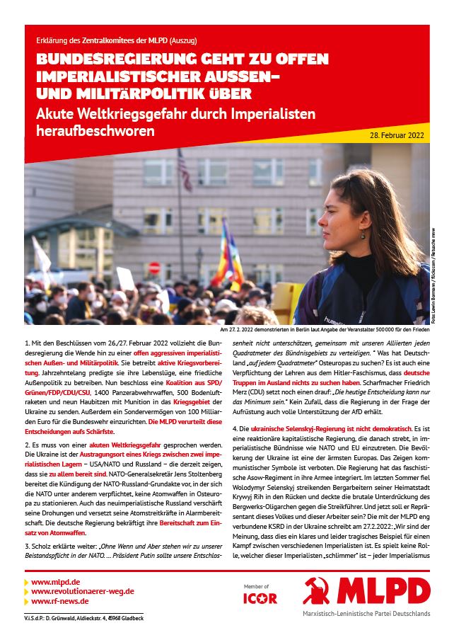 Vordergrundbild z.B. ein Screenshot des Flugblattes Hintergrundbild z.B. ein Foto 319 * 177 Pixel breit Text kurzer Anreißer z.B. "Erklärung des Zentralkomitees der MLPD: Aktiver Widerstand gegen imperialistische Kriegsvorbereitung!" Bundesregierung geht zu offen imperialistischer Außen- und Militärpolitik über - akute Weltkriegsgefahr durch Imperialisten heraufbeschworen Buttontext z.B. "Flugblatt lesen" Flugblatt lesen Buttonlink z.B. "2018/kw14/dieses-flugblatt-in-pdf-format-in-farbe" 2022/02/bundesregierung-geht-zu-offen-imperialistischer-aussen-und-militaerpolitik-ueber-akute-weltkriegsgefahr-durch-imperialisten-heraufbeschworen Inhalte Dieser Ordner hat zur Zeit keinen Inhalt.
