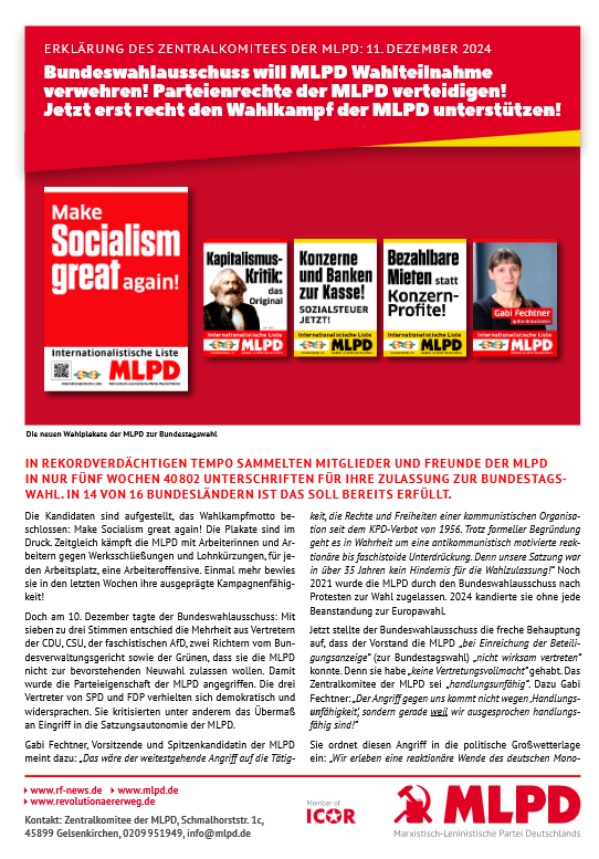 Vordergrundbild z.B. ein Screenshot des Flugblattes Hintergrundbild z.B. ein Foto 319 * 177 Pixel breit Text kurzer Anreißer z.B. "Erklärung des Zentralkomitees der MLPD: Aktiver Widerstand gegen imperialistische Kriegsvorbereitung!" Bundeswahlausschuss will Wahlzulassung der MLPD verbieten und greift ihre Parteienrechte an. Buttontext z.B. "Flugblatt lesen" Flugblatt lesen Buttonlink z.B. "2018/kw14/dieses-flugblatt-in-pdf-format-in-farbe" 2024/12/bundeswahlausschuss-will-wahlzulassung-der-mlpd-verbieten-und-greift-ihre-parteienrechte-an Inhalte Dieser Ordner hat zur Zeit keinen Inhalt.