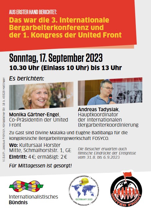 Vordergrundbild z.B. ein Screenshot des Flugblattes Hintergrundbild z.B. ein Foto 319 * 177 Pixel breit Text kurzer Anreißer z.B. "Erklärung des Zentralkomitees der MLPD: Aktiver Widerstand gegen imperialistische Kriegsvorbereitung!" Das war die 3. Internationale Bergarbeiterkonferenz und der 1. Kongress der United Front Buttontext z.B. "Flugblatt lesen" Flyer lesen Buttonlink z.B. "2018/kw14/dieses-flugblatt-in-pdf-format-in-farbe" https://www.mlpd.de/2023/09/das-war-die-3-internationale-bergarbeiterkonferenz-und-der-1-kongress-der-united-front Inhalte Dieser Ordner hat zur Zeit keinen Inhalt.