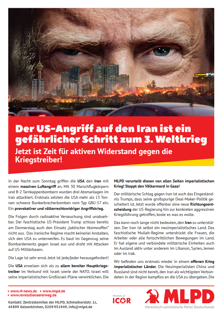 Vordergrundbild z.B. ein Screenshot des Flugblattes Hintergrundbild z.B. ein Foto 319 * 177 Pixel breit Text kurzer Anreißer z.B. "Erklärung des Zentralkomitees der MLPD: Aktiver Widerstand gegen imperialistische Kriegsvorbereitung!" Der US-Angriff auf den Iran ist ein gefährlicher Schritt zum dritten Weltkrieg Buttontext z.B. "Flugblatt lesen" Flugblatt lesen Buttonlink z.B. "2018/kw14/dieses-flugblatt-in-pdf-format-in-farbe" 2025/06/der-us-angriff-auf-den-iran-ist-ein-gefaehrlicher-schritt-zum-dritten-weltkrieg Inhalte Dieser Ordner hat zur Zeit keinen Inhalt.