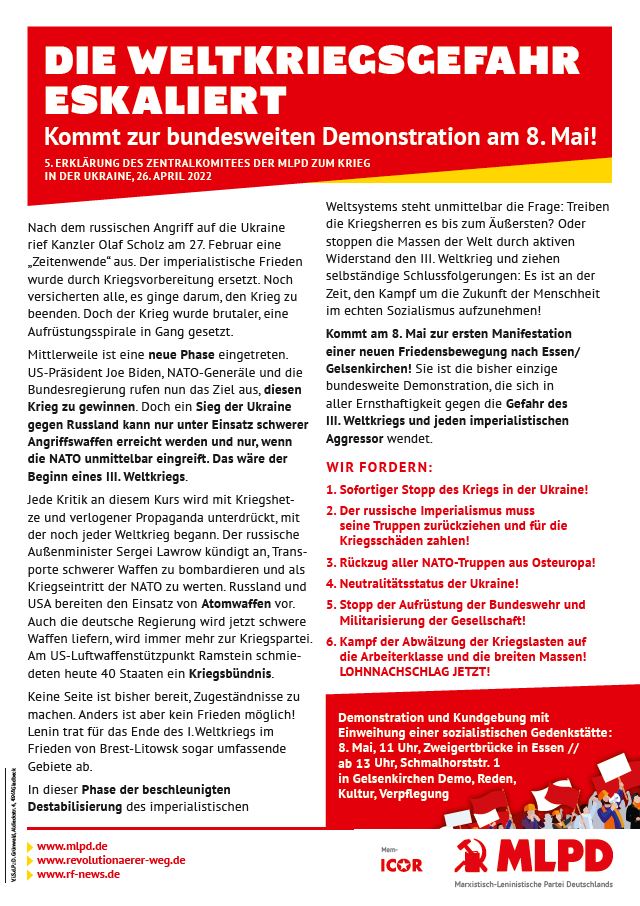 Vordergrundbild z.B. ein Screenshot des Flugblattes Hintergrundbild z.B. ein Foto 319 * 177 Pixel breit Text kurzer Anreißer z.B. "Erklärung des Zentralkomitees der MLPD: Aktiver Widerstand gegen imperialistische Kriegsvorbereitung!" Die Weltkriegsgefahr eskaliert - Kommt zur bundesweiten Demonstration am 8. Mai! Buttontext z.B. "Flugblatt lesen" Flugblatt lesen Buttonlink z.B. "2018/kw14/dieses-flugblatt-in-pdf-format-in-farbe" 2022/04/die-weltkriegsgefahr-eskaliert-dieser-kurs-fuehrt-in-den-iii-weltkrieg-kommt-zur-bundesweiten-demonstration-am-8-mai Inhalte Dieser Ordner hat zur Zeit keinen Inhalt.