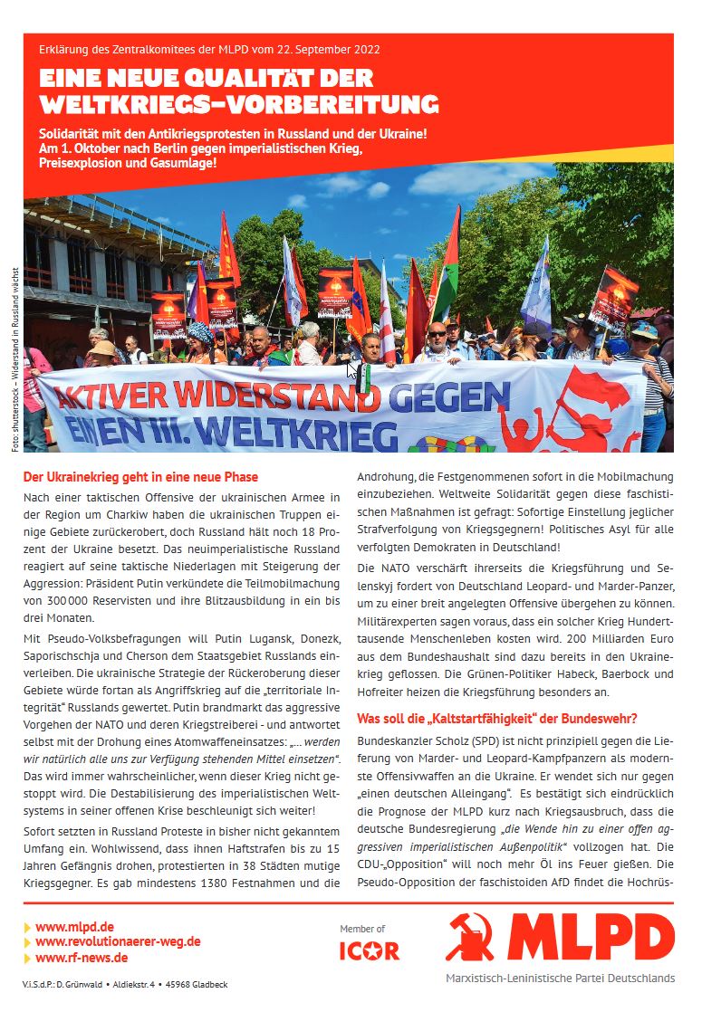 Vordergrundbild z.B. ein Screenshot des Flugblattes Hintergrundbild z.B. ein Foto 319 * 177 Pixel breit Text kurzer Anreißer z.B. "Erklärung des Zentralkomitees der MLPD: Aktiver Widerstand gegen imperialistische Kriegsvorbereitung!" Eine neue Qualität der Weltkriegsvorbereitung - Solidarität mit den Antikriegsprotesten in Russland und der Ukraine! Am 1. Oktober nach Berlin gegen imperialistischen Krieg, Preisexplosion und Gasumlage! Buttontext z.B. "Flugblatt lesen" Flugblatt lesen Buttonlink z.B. "2018/kw14/dieses-flugblatt-in-pdf-format-in-farbe" 2022/09/weltkriegsvorbereitung Inhalte Dieser Ordner hat zur Zeit keinen Inhalt.