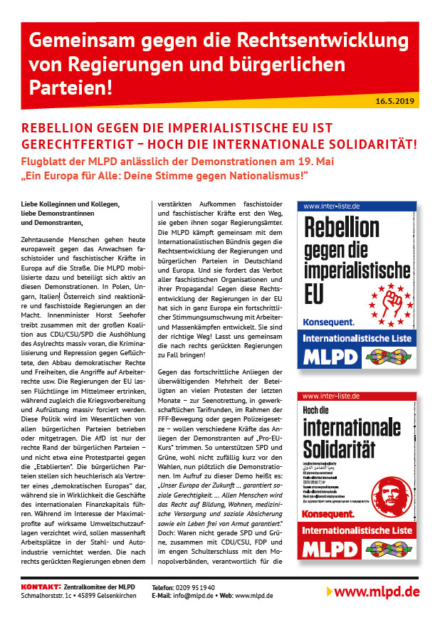 Vordergrundbild z.B. ein Screenshot des Flugblattes Hintergrundbild z.B. ein Foto 319 * 177 Pixel breit Text kurzer Anreißer z.B. "Erklärung des Zentralkomitees der MLPD: Aktiver Widerstand gegen imperialistische Kriegsvorbereitung!" Gemeinsam gegen die Rechtsentwicklung von Regierungen und bürgerlichen Parteien! Buttontext z.B. "Flugblatt lesen" Flugblatt lesen Buttonlink z.B. "2018/kw14/dieses-flugblatt-in-pdf-format-in-farbe" 2019/05/gemeinsam-gegen-die-rechtsentwicklung-von-regierungen-und-buergerlichen-parteien Inhalte Dieser Ordner hat zur Zeit keinen Inhalt.