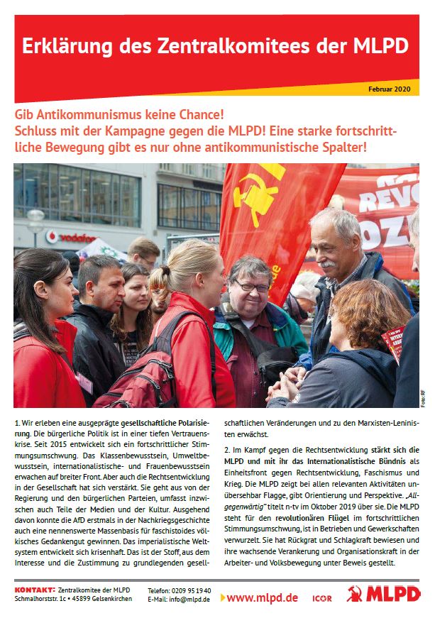 Vordergrundbild z.B. ein Screenshot des Flugblattes Hintergrundbild z.B. ein Foto 319 * 177 Pixel breit Text kurzer Anreißer z.B. "Erklärung des Zentralkomitees der MLPD: Aktiver Widerstand gegen imperialistische Kriegsvorbereitung!" Gib Antikommunismus keine Chance! Buttontext z.B. "Flugblatt lesen" Flugblatt lesen Buttonlink z.B. "2018/kw14/dieses-flugblatt-in-pdf-format-in-farbe" 2020/02/gib-antikommunismus-keine-chance_web.pdf Inhalte Dieser Ordner hat zur Zeit keinen Inhalt.