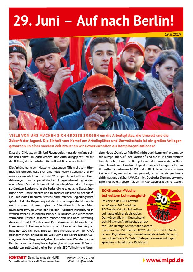 Vordergrundbild z.B. ein Screenshot des Flugblattes Hintergrundbild z.B. ein Foto 319 * 177 Pixel breit Text kurzer Anreißer z.B. "Erklärung des Zentralkomitees der MLPD: Aktiver Widerstand gegen imperialistische Kriegsvorbereitung!" IG Metall-Kundgebung - 29. Juni - Auf nach Berlin! Buttontext z.B. "Flugblatt lesen" Flugblatt lesen Buttonlink z.B. "2018/kw14/dieses-flugblatt-in-pdf-format-in-farbe" 2019/06/29-juni-auf-nach-berlin Inhalte Dieser Ordner hat zur Zeit keinen Inhalt.