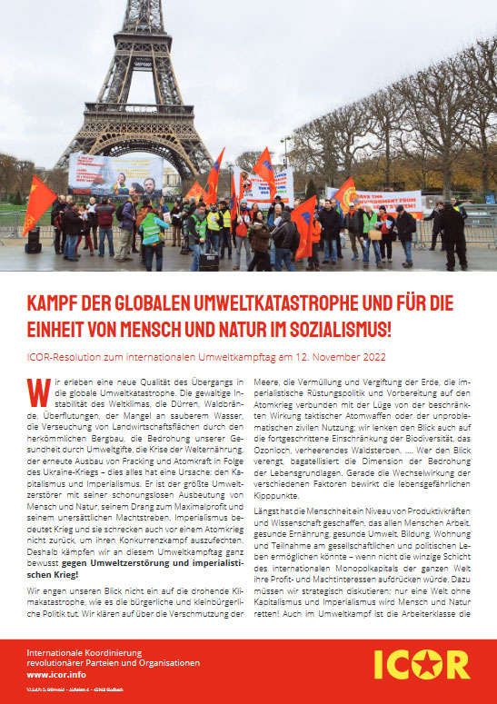 Vordergrundbild z.B. ein Screenshot des Flugblattes Hintergrundbild z.B. ein Foto 319 * 177 Pixel breit Text kurzer Anreißer z.B. "Erklärung des Zentralkomitees der MLPD: Aktiver Widerstand gegen imperialistische Kriegsvorbereitung!" Kampf der globalen Umweltkatastrophe und für die Einheit von Mensch und Natur im Sozialismus! Buttontext z.B. "Flugblatt lesen" Flugblatt lesen Buttonlink z.B. "2018/kw14/dieses-flugblatt-in-pdf-format-in-farbe" 2022/11/kampf-der-globalen-umweltkatastrophe-und-fuer-die-einheit-von-mensch-und-natur-im-sozialismus Inhalte Dieser Ordner hat zur Zeit keinen Inhalt.