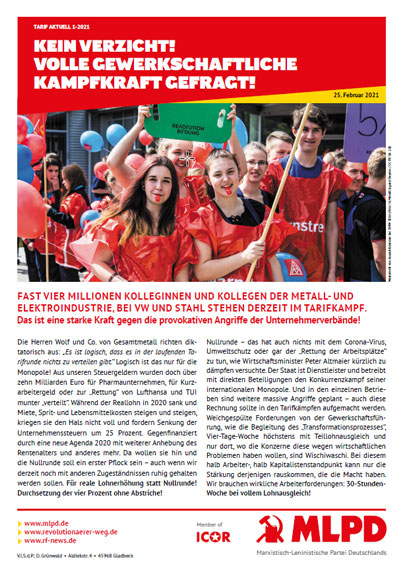 Vordergrundbild z.B. ein Screenshot des Flugblattes Hintergrundbild z.B. ein Foto 319 * 177 Pixel breit Text kurzer Anreißer z.B. "Erklärung des Zentralkomitees der MLPD: Aktiver Widerstand gegen imperialistische Kriegsvorbereitung!" Tarif Aktuell 1-2021: Kein Verzicht! Volle gewerkschaftliche Kampfkraft gefragt! Buttontext z.B. "Flugblatt lesen" Flugblatt lesen Buttonlink z.B. "2018/kw14/dieses-flugblatt-in-pdf-format-in-farbe" https://www.mlpd.de/2021/03/kein-verzicht-volle-gewerkschaftliche-kampfkraft-gefragt Inhalte Dieser Ordner hat zur Zeit keinen Inhalt.