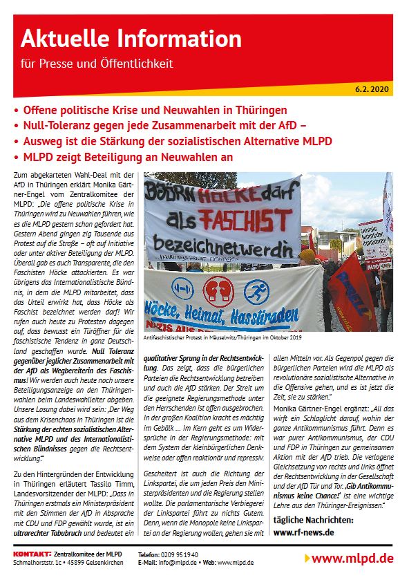 Vordergrundbild z.B. ein Screenshot des Flugblattes Hintergrundbild z.B. ein Foto 319 * 177 Pixel breit Text kurzer Anreißer z.B. "Erklärung des Zentralkomitees der MLPD: Aktiver Widerstand gegen imperialistische Kriegsvorbereitung!" Offene politische Krise und Neuwahlen in Thüringen - Null-Toleranz gegen jede Zusammenarbeit mit der AfD Buttontext z.B. "Flugblatt lesen" Flugblatt lesen Buttonlink z.B. "2018/kw14/dieses-flugblatt-in-pdf-format-in-farbe" 2020/02/neuwahlen-thueringen.pdf Inhalte Dieser Ordner hat zur Zeit keinen Inhalt.