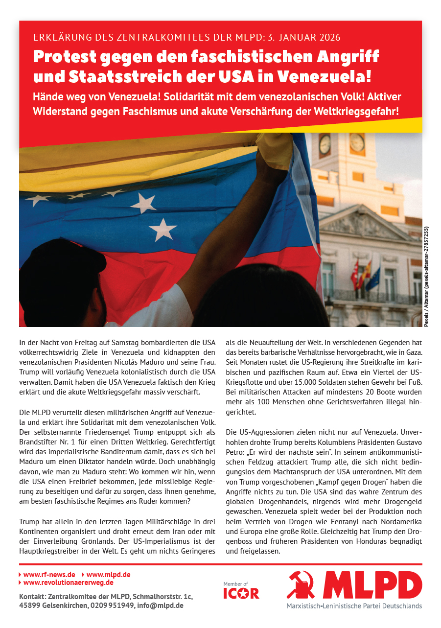 Vordergrundbild z.B. ein Screenshot des Flugblattes Hintergrundbild z.B. ein Foto 319 * 177 Pixel breit Text kurzer Anreißer z.B. "Erklärung des Zentralkomitees der MLPD: Aktiver Widerstand gegen imperialistische Kriegsvorbereitung!" Protest gegen den faschistischen Angriff und Staatsstreich der USA in Venezuela! Buttontext z.B. "Flugblatt lesen" Flugblatt lesen Buttonlink z.B. "2018/kw14/dieses-flugblatt-in-pdf-format-in-farbe" 2026/01/protest-gegen-den-faschistischen-angriff-und-staatsstreich-der-usa-in-venezuela Inhalte Dieser Ordner hat zur Zeit keinen Inhalt.