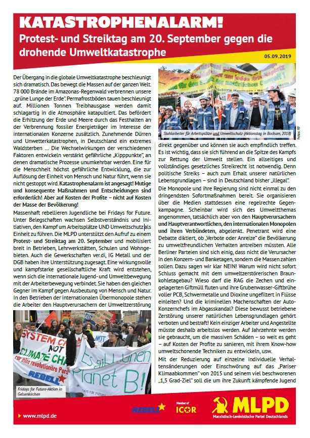 Vordergrundbild z.B. ein Screenshot des Flugblattes Hintergrundbild z.B. ein Foto 319 * 177 Pixel breit Text kurzer Anreißer z.B. "Erklärung des Zentralkomitees der MLPD: Aktiver Widerstand gegen imperialistische Kriegsvorbereitung!" Katastrophenalarm! Protest- und Streiktag am 20. September gegen die drohende Umweltkatastrophe Buttontext z.B. "Flugblatt lesen" Flugblatt lesen Buttonlink z.B. "2018/kw14/dieses-flugblatt-in-pdf-format-in-farbe" 2019/09/katastrophenalarm-protest-und-streiktag-am-20-september-gegen-die-drohende-umweltkatastrophe.pdf Inhalte Dieser Ordner hat zur Zeit keinen Inhalt.