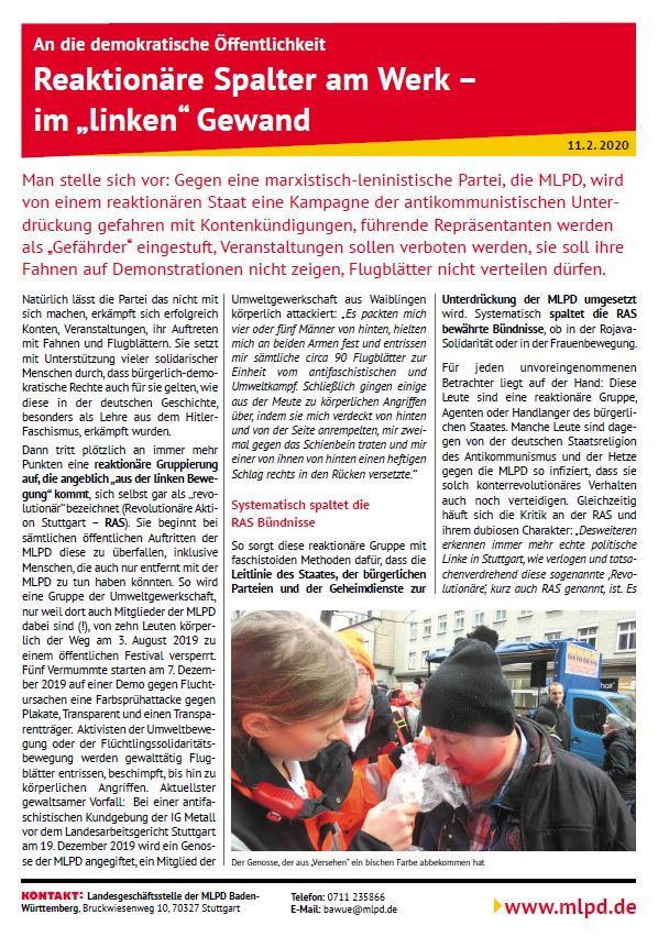 Vordergrundbild z.B. ein Screenshot des Flugblattes Hintergrundbild z.B. ein Foto 319 * 177 Pixel breit Text kurzer Anreißer z.B. "Erklärung des Zentralkomitees der MLPD: Aktiver Widerstand gegen imperialistische Kriegsvorbereitung!" "Reaktionäre Spalter am Werk - im 'linken Gewand" Buttontext z.B. "Flugblatt lesen" Flugblatt lesen Buttonlink z.B. "2018/kw14/dieses-flugblatt-in-pdf-format-in-farbe" 2020/02/reaktionaere-spalter-am-werk.pdf Inhalte Dieser Ordner hat zur Zeit keinen Inhalt.