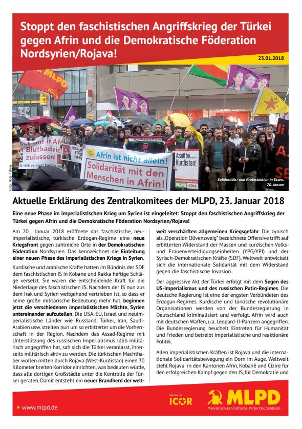 Vordergrundbild z.B. ein Screenshot des Flugblattes Hintergrundbild z.B. ein Foto 319 * 177 Pixel breit Text kurzer Anreißer z.B. "Erklärung des Zentralkomitees der MLPD: Aktiver Widerstand gegen imperialistische Kriegsvorbereitung!" Stoppt den faschistischen Angriffskrieg der Türkei gegen Afrin und die Demokratische Föderation Nordsyrien/Rojava! Buttontext z.B. "Flugblatt lesen" Flugblatt lesen Buttonlink z.B. "2018/kw14/dieses-flugblatt-in-pdf-format-in-farbe" 2018/kw02/afrin-2.pdf Inhalte Dieser Ordner hat zur Zeit keinen Inhalt.