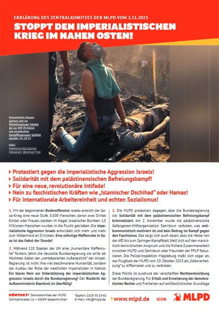 Vordergrundbild z.B. ein Screenshot des Flugblattes Hintergrundbild z.B. ein Foto 319 * 177 Pixel breit Text kurzer Anreißer z.B. "Erklärung des Zentralkomitees der MLPD: Aktiver Widerstand gegen imperialistische Kriegsvorbereitung!" Stoppt den imperialistischen Krieg im Nahen Osten! Protestiert gegen die imperialistische Aggression Israels! Buttontext z.B. "Flugblatt lesen" Flugblatt lesen Buttonlink z.B. "2018/kw14/dieses-flugblatt-in-pdf-format-in-farbe" 2023/11/stoppt-den-imperialistischen-krieg-im-nahen-osten Inhalte Dieser Ordner hat zur Zeit keinen Inhalt.