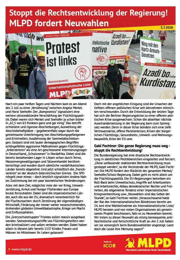 Vordergrundbild z.B. ein Screenshot des Flugblattes Hintergrundbild z.B. ein Foto 319 * 177 Pixel breit Text kurzer Anreißer z.B. "Erklärung des Zentralkomitees der MLPD: Aktiver Widerstand gegen imperialistische Kriegsvorbereitung!" Die MLPD fordert Neuwahlen und Rücktritt der Regierung. Sie informiert auch über die Angriffe auf ihre Parteizentrale. Buttontext z.B. "Flugblatt lesen" Flugblatt lesen Buttonlink z.B. "2018/kw14/dieses-flugblatt-in-pdf-format-in-farbe" https://www.rf-news.de/2018/kw27-1/180703-flugblatt-mlpd-fordert-neuwahlen_rz.pdf Inhalte Dieser Ordner hat zur Zeit keinen Inhalt.