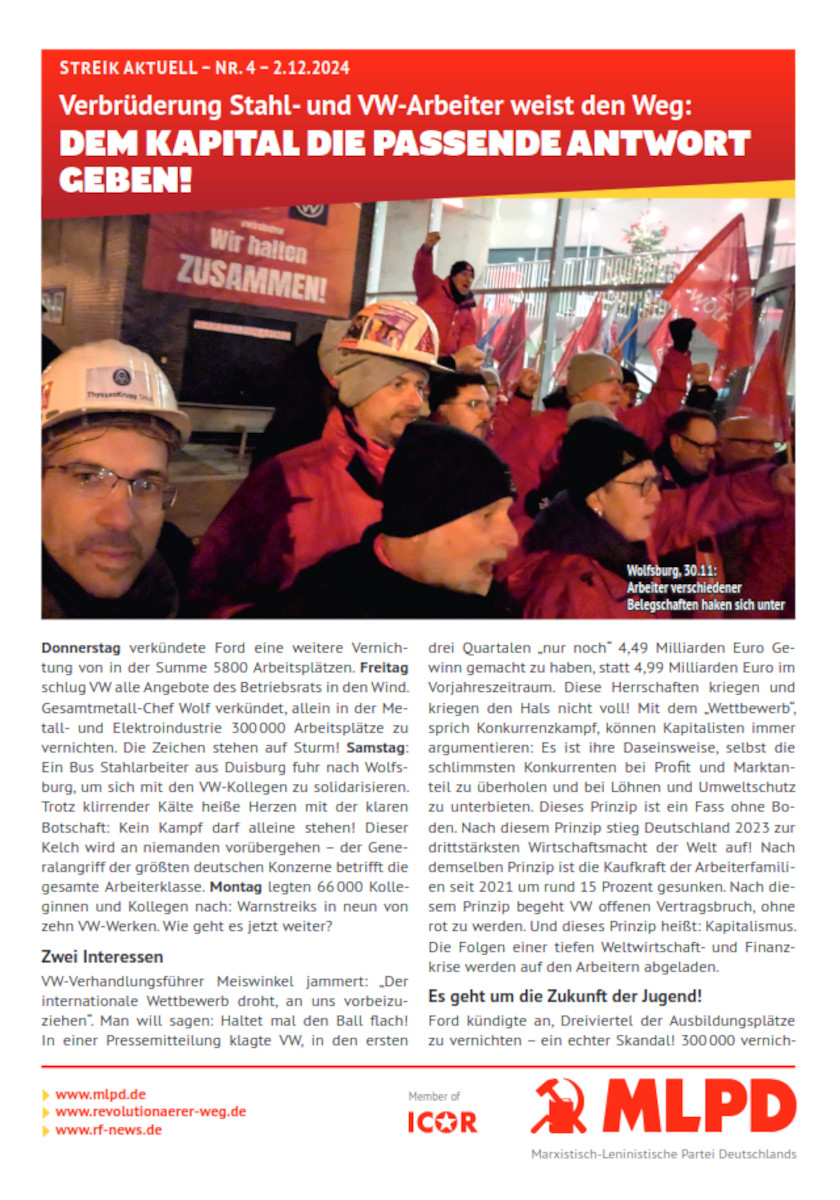 Vordergrundbild z.B. ein Screenshot des Flugblattes Hintergrundbild z.B. ein Foto 319 * 177 Pixel breit Text kurzer Anreißer z.B. "Erklärung des Zentralkomitees der MLPD: Aktiver Widerstand gegen imperialistische Kriegsvorbereitung!" Streik Aktuell 4: Verbrüderung Stahl- und VW-Arbeiter weist den Weg: Dem Kapital die passende Antwort geben! Buttontext z.B. "Flugblatt lesen" Flugblatt lesen Buttonlink z.B. "2018/kw14/dieses-flugblatt-in-pdf-format-in-farbe" 2024/12/verbruederung-stahl-und-vw-arbeiter-weist-den-weg-dem-kapital-die-passende-antwort-geben Inhalte Dieser Ordner hat zur Zeit keinen Inhalt.