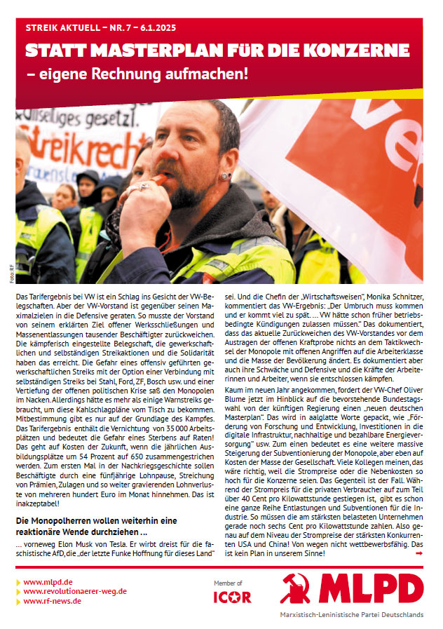Vordergrundbild z.B. ein Screenshot des Flugblattes Hintergrundbild z.B. ein Foto 319 * 177 Pixel breit Text kurzer Anreißer z.B. "Erklärung des Zentralkomitees der MLPD: Aktiver Widerstand gegen imperialistische Kriegsvorbereitung!" Streik Aktuell 7: Statt Masterplan für die Konzerne – eigene Rechnung aufmachen! Buttontext z.B. "Flugblatt lesen" Flugblatt lesen Buttonlink z.B. "2018/kw14/dieses-flugblatt-in-pdf-format-in-farbe" 2025/01/statt-masterplan-fuer-die-konzerne-eigene-rechnung-aufmachen Inhalte Dieser Ordner hat zur Zeit keinen Inhalt.