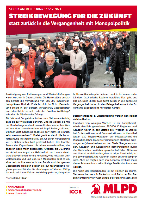 Vordergrundbild z.B. ein Screenshot des Flugblattes Hintergrundbild z.B. ein Foto 319 * 177 Pixel breit Text kurzer Anreißer z.B. "Erklärung des Zentralkomitees der MLPD: Aktiver Widerstand gegen imperialistische Kriegsvorbereitung!" Streik Aktuell 6: Streikbewegung für die Zukunft statt zurück in die Vergangenheit mit Monopolpolitik Buttontext z.B. "Flugblatt lesen" Flugblatt lesen Buttonlink z.B. "2018/kw14/dieses-flugblatt-in-pdf-format-in-farbe" 2024/12/streikbewegung-fuer-die-zukunft-statt-zurueck-in-die-vergangenheit-mit-monopolpolitik Inhalte Dieser Ordner hat zur Zeit keinen Inhalt.