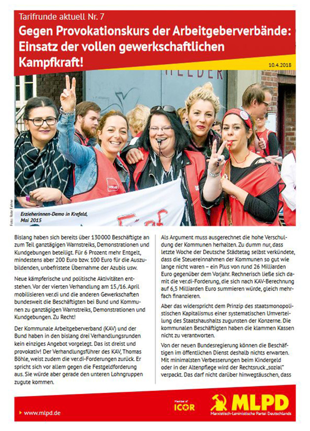 Vordergrundbild z.B. ein Screenshot des Flugblattes Hintergrundbild z.B. ein Foto 319 * 177 Pixel breit Text kurzer Anreißer z.B. "Erklärung des Zentralkomitees der MLPD: Aktiver Widerstand gegen imperialistische Kriegsvorbereitung!" Tarifrunde aktuell Nr. 7: Gegen Provokationskurs der Arbeitgeberverbände: Einsatz der vollen gewerkschaftlichen Kampfkraft! Buttontext z.B. "Flugblatt lesen" Flugblatt lesen Buttonlink z.B. "2018/kw14/dieses-flugblatt-in-pdf-format-in-farbe" https://www.mlpd.de/2018/kw14/MLPDTarifrunde_aktuell_Nr7_Farbe.pdf Inhalte Dieser Ordner hat zur Zeit keinen Inhalt.