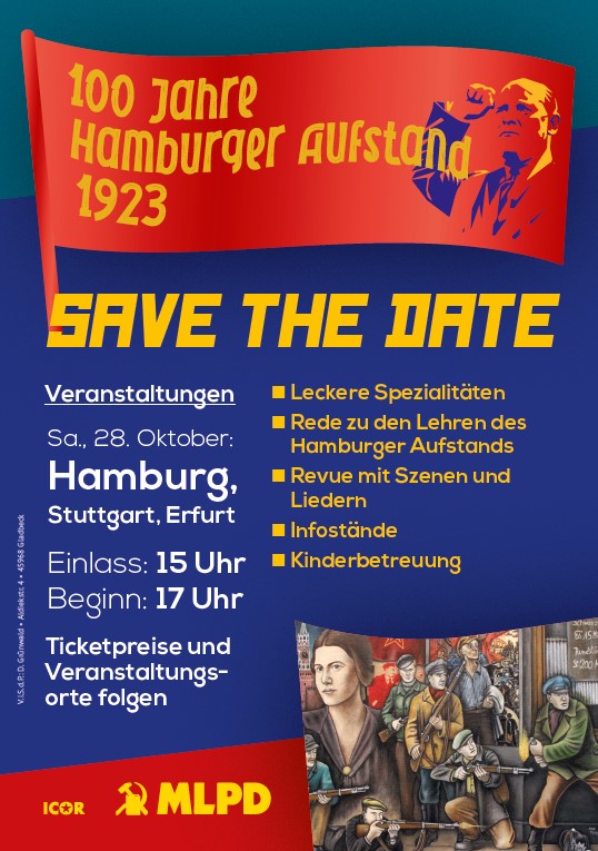 Vordergrundbild z.B. ein Screenshot des Flugblattes Hintergrundbild z.B. ein Foto 319 * 177 Pixel breit Text kurzer Anreißer z.B. "Erklärung des Zentralkomitees der MLPD: Aktiver Widerstand gegen imperialistische Kriegsvorbereitung!" Veranstaltungen der MLPD zu "100 Jahre Hamburger Aufstand" Buttontext z.B. "Flugblatt lesen" Flugblatt lesen Buttonlink z.B. "2018/kw14/dieses-flugblatt-in-pdf-format-in-farbe" 2023/08/veranstaltungen-der-mlpd-zu-100-jahre-hamburger-aufstand Inhalte Dieser Ordner hat zur Zeit keinen Inhalt.