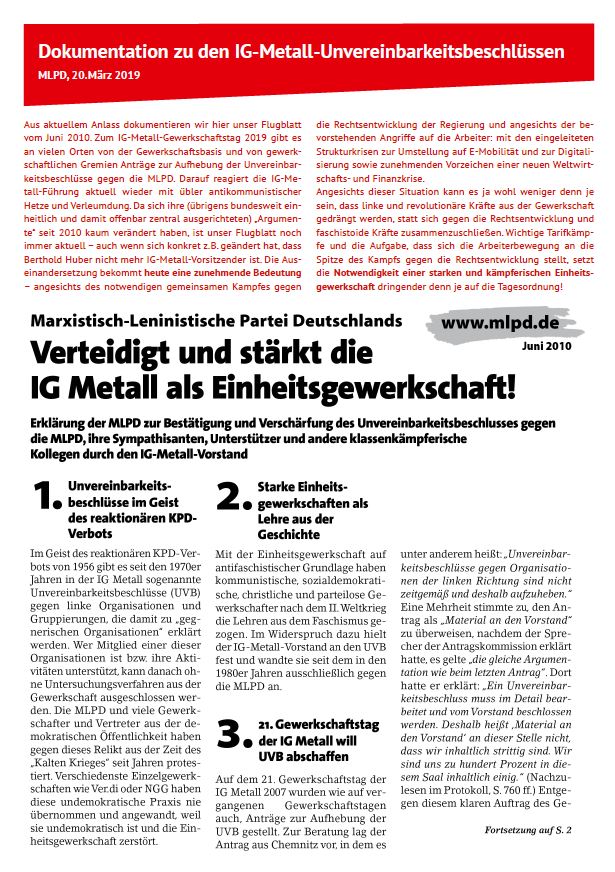 Vordergrundbild z.B. ein Screenshot des Flugblattes Hintergrundbild z.B. ein Foto 319 * 177 Pixel breit Text kurzer Anreißer z.B. "Erklärung des Zentralkomitees der MLPD: Aktiver Widerstand gegen imperialistische Kriegsvorbereitung!" Verteidigt und stärkt die IG Metall als Einheitsgewerkschaft Buttontext z.B. "Flugblatt lesen" Flugblatt lesen Buttonlink z.B. "2018/kw14/dieses-flugblatt-in-pdf-format-in-farbe" 2019/03/verteidigt-und-staerkt-die-ig-metall-als-einheitsgewerkschaft Inhalte Dieser Ordner hat zur Zeit keinen Inhalt.