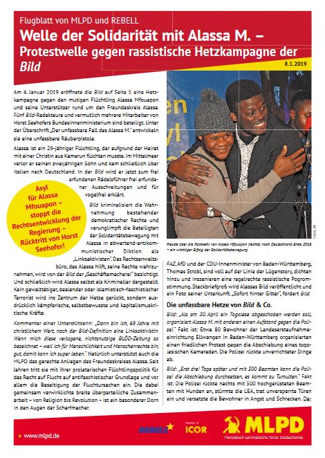 Vordergrundbild z.B. ein Screenshot des Flugblattes Hintergrundbild z.B. ein Foto 319 * 177 Pixel breit Text kurzer Anreißer z.B. "Erklärung des Zentralkomitees der MLPD: Aktiver Widerstand gegen imperialistische Kriegsvorbereitung!" Welle der Solidarität mit Alassa M. – Protestwelle gegen rassistische Hetzkampagne der Bild Buttontext z.B. "Flugblatt lesen" Flugblatt lesen Buttonlink z.B. "2018/kw14/dieses-flugblatt-in-pdf-format-in-farbe" https://www.rf-news.de/2019/kw02/protestwelle-gegen-rassistische-hetzkampagne-welle-der-solidaritaet-mit-alassa-m Inhalte Dieser Ordner hat zur Zeit keinen Inhalt.