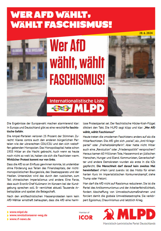 Vordergrundbild z.B. ein Screenshot des Flugblattes Hintergrundbild z.B. ein Foto 319 * 177 Pixel breit Text kurzer Anreißer z.B. "Erklärung des Zentralkomitees der MLPD: Aktiver Widerstand gegen imperialistische Kriegsvorbereitung!" Wer AfD wählt, wählt Faschismus! Buttontext z.B. "Flugblatt lesen" Flugblatt lesen Buttonlink z.B. "2018/kw14/dieses-flugblatt-in-pdf-format-in-farbe" 2024/06/wer-afd-waehlt-waehlt-faschismus Inhalte Dieser Ordner hat zur Zeit keinen Inhalt.